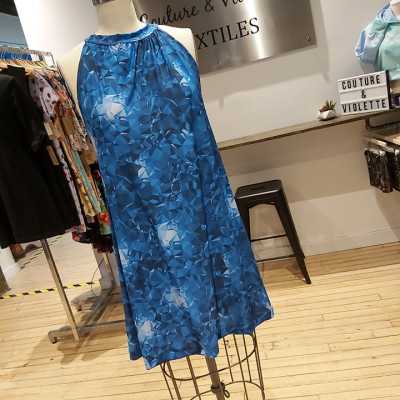 Robe longue réalisée dans le motif Texture Géo – Bleu Cristal, imprimé sur le tissu Butterknit Trico...